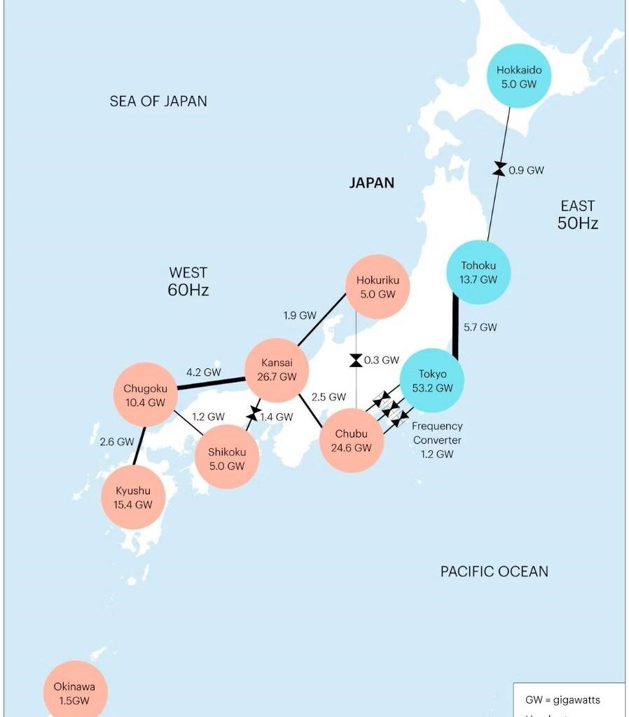 Trong quá trình hiện đại hóa vào cuối thế kỷ 19, Nhật Bản đã tiếp nhận các công nghệ khác nhau từ châu Âu và Mỹ, dẫn đến sự khác biệt về tần số nguồn điện (60Hz ở miền tây Nhật Bản và 50Hz ở miền đông Nhật Bản).
