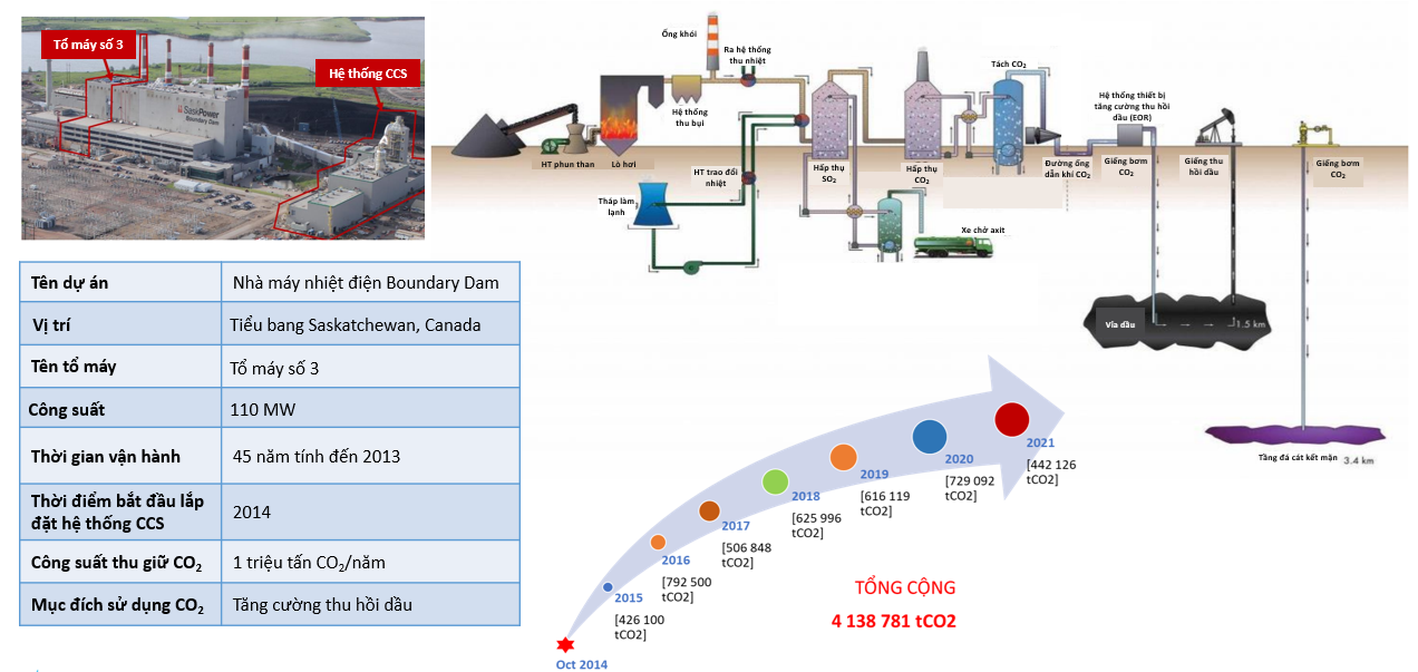 Ví dụ: Dự án Boundary Dam CCS ở Canada, hệ thống CCS thương mại đầu tiên trên thế giới áp dụng tại nhà máy nhiệt điện than, có chi phí xây dựng là 1,3 tỷ USD. Dự án này đã đi vào hoạt động chính thức từ cuối năm 2016 với công suất thu giữ CO2 là 1 Mtpa (xem hình 2). Một trường hợp khác là dự án Gorgon CCS ở Australia – nơi mà CO2 được thu giữ từ nhà máy xử lý khí tự nhiên và bơm vào một tầng chứa đá sa thạch sâu nằm trong đất liền. Dự án này có chi phí khoảng 2 tỷ USD cho công suất thu giữ CO2 là 3,4 – 4 Mtpa.