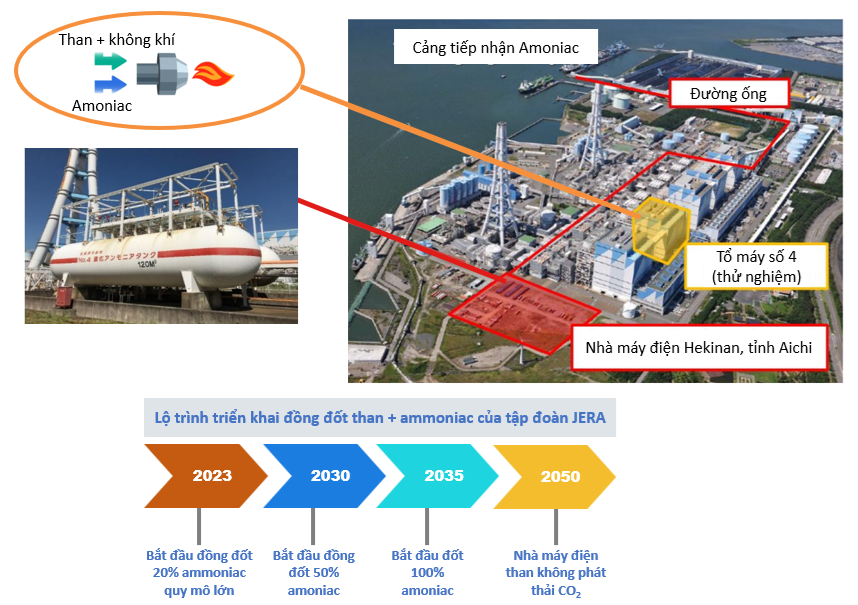 Hiện nay, việc chuyển đổi nhiên liệu của các nhà máy nhiệt điện sang sử dụng amoniac đã được các tổ chức quốc tế và các nước nghiên cứu thử nghiệm thành công với tỷ lệ amoniac đạt 20%. Tại Nhật Bản, công ty JERA đã triển khai trình diễn công nghệ đồng đốt 20% amoniac với than (xem hình 3). Tuy nhiên, việc tăng tỉ lệ đốt kèm, giảm giá thành sản xuất điện để thương mại hoá trong chuyển đổi nhiên liệu cho các nhà máy điện than cần phải được tiếp tục nghiên cứu thêm trong thời gian tới.
