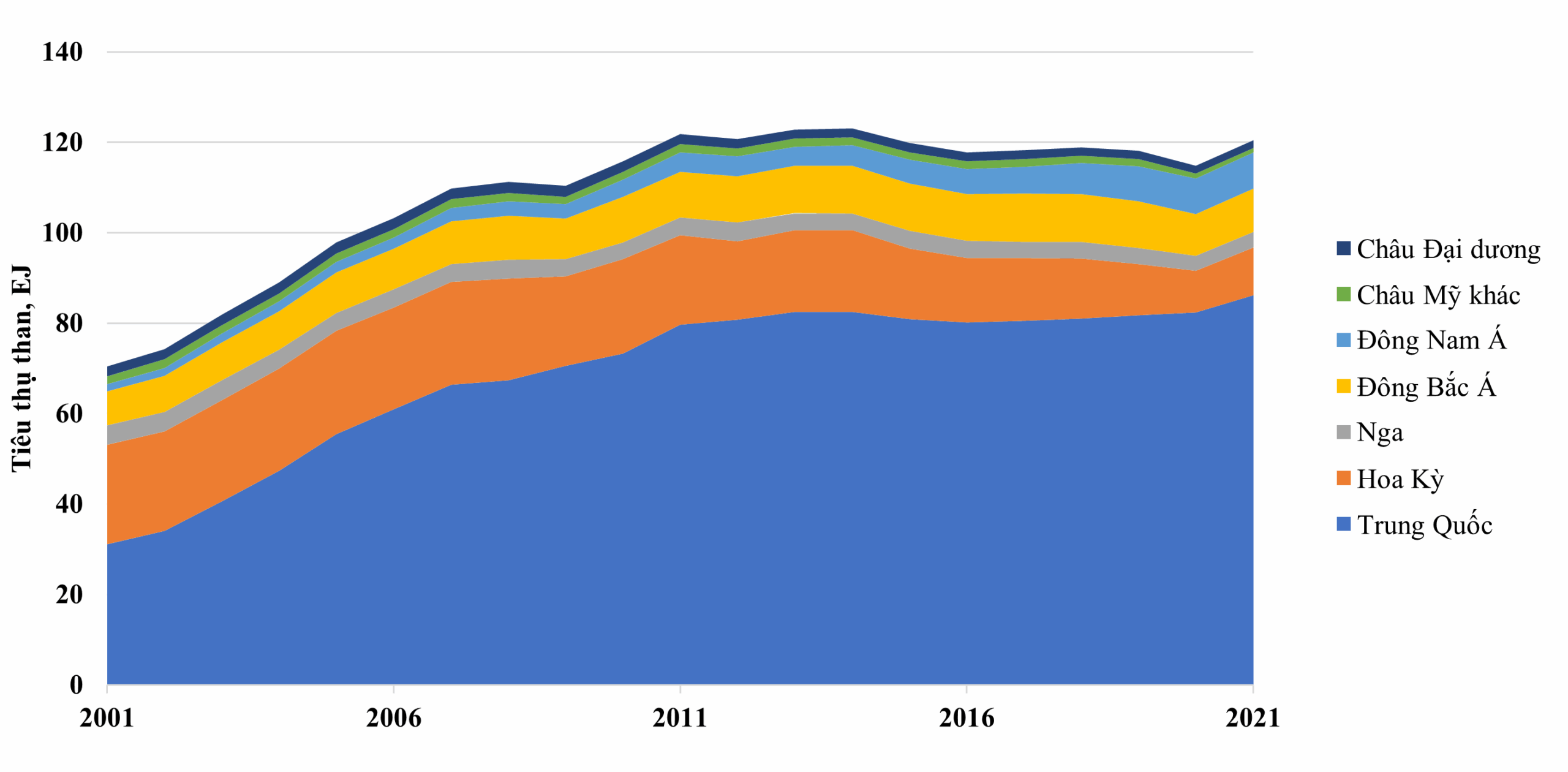 Tiêu thụ than toàn khối APEC đã tăng 1,7 lần trong hai thập kỷ qua (2001-2021), đạt mức cao nhất là 123 exajoules (EJ) vào năm 2014, tương đương 4365 triệu tấn than chuẩn (tce). Năm 2021, mức tiêu thụ than toàn APEC tăng khoảng 5% so với mức năm 2020, đạt 120 EJ, gần với mức tiêu thụ than cao nhất vào năm 2014 (xem hình 1).