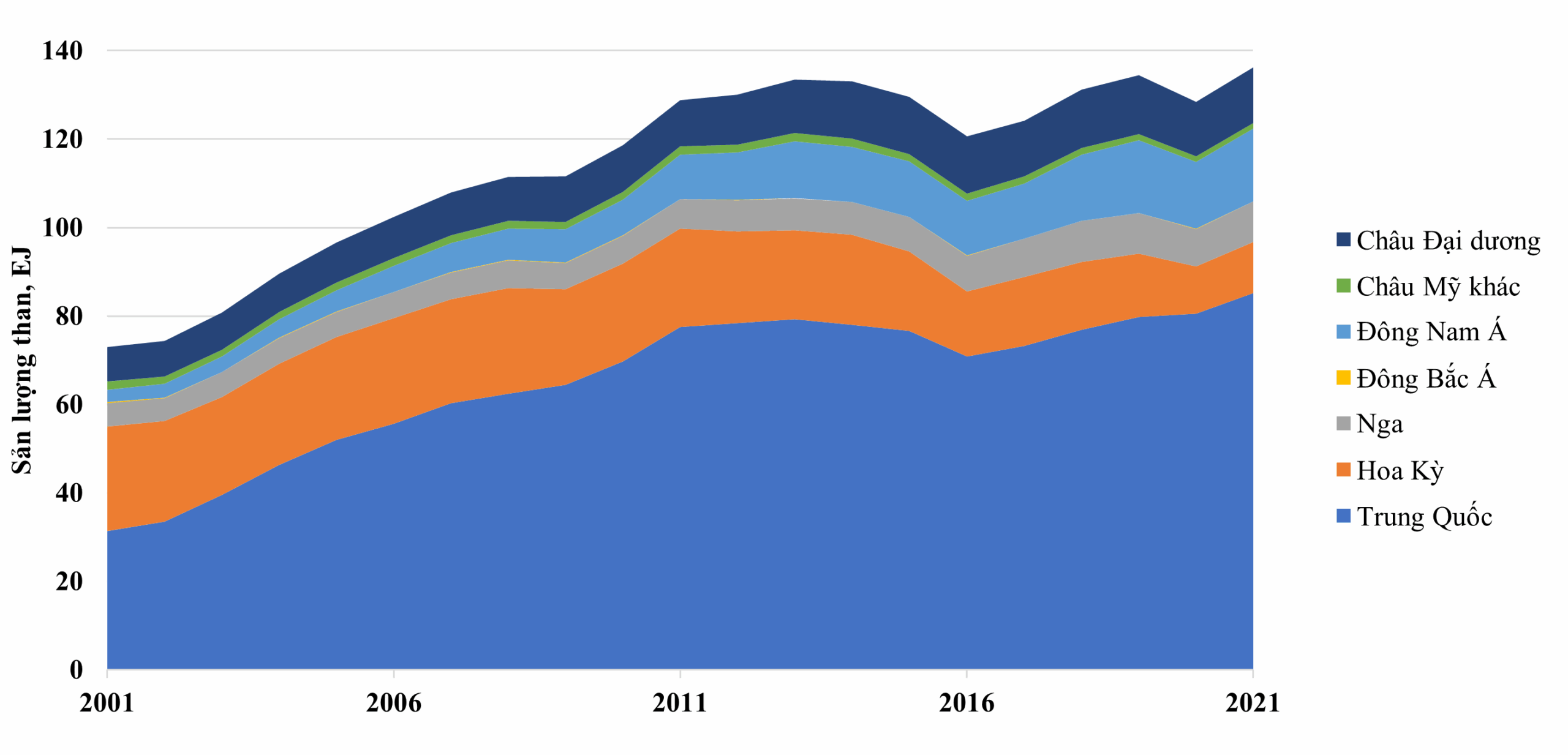 Sản xuất than toàn APEC tăng khoảng 1,9 lần trong giai đoạn 2001-2021 để đáp ứng nhu cầu về năng lượng cho tăng trưởng kinh tế. Năm 2021, sản lượng than của APEC đạt kỷ lục cao nhất mọi thời đại là 136,2 EJ, tăng 6,1% so với năm trước (xem hình 2).