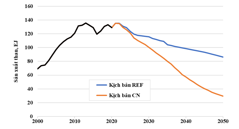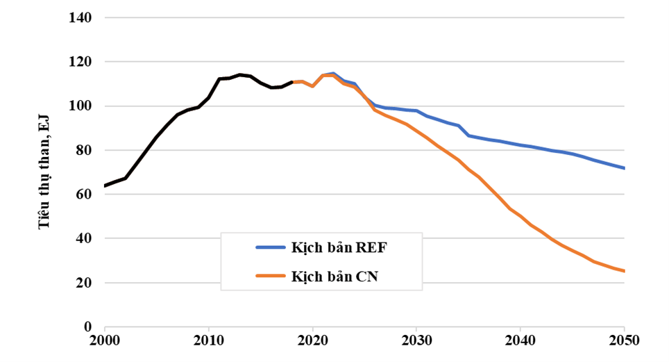 Tại kịch bản CN, lượng than tiêu thụ được dự báo giảm gần 80% vào năm 2050 so với mức của năm 2018 và chủ yếu giảm ở lĩnh vực sản xuất điện. Tuy vậy, nhu cầu về than trong lịch bản này vẫn là 25,4 EJ vào năm 2050.